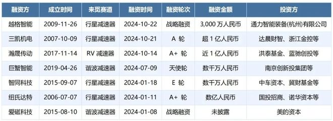 近一年来,获得融资的减速器企业已成立5年及以上,主要原因在于减速器是技术密集型行业,在材料、加工工艺、加工设备等方面存在较高技术壁垒,需要较长时间的技术积累和市场验证,先进入者具备先发优势,初创企业难以快速获得市场认可和投资。