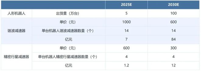在2022年特斯拉AI Day上,马斯克称特斯拉人形机器人Optimus有望在3-5年内交付,生产规模可达数百万台。基于此,在中性情形下,假设到2030年,人形机器人出货量达100万台。在谐波减速器方面,假设单台人形机器人身体谐波减速器需求为14个(基于Optimus方案),单价在2030年下降至600元,则对应的谐波减速器市场空间为84亿元。在精密行星减速器方面,假设单台人形机器人对精密行星减速器需求为4个(双腿各1个+髋部2个),单价在2030年下降至300元,则对应的谐波减速器市场空间为12亿元。在此情形下,人形机器人预计将可为精密减速器带来近百亿的市场空间。