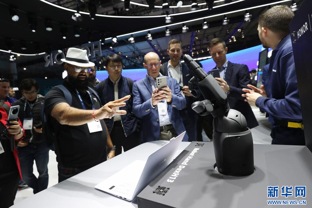 3月3日,在西班牙巴塞罗那举行的2025年世界移动通信大会上,参观者与多维触觉灵巧手互动。