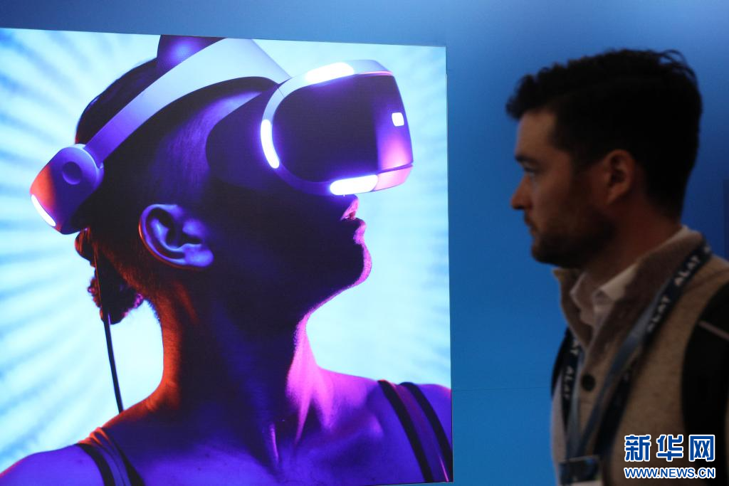 3月3日,在西班牙巴塞罗那举行的2025年世界移动通信大会上,一名参观者走过头显设备展台。