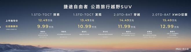 4月28日,以‘自由’之名,捷途自由者全国上市发布会·秦皇岛站于如是海沙滩边燃情启幕。海浪为幕,潮声作伴,自由者以‘公路旅行越野SUV’之姿,携XWD智能四驱,与浪花共舞,让越野基因与碧海金沙碰撞出自由新境。”活动中,共推出4款车型,价格分别为:1.5TD-7DCT探索12.49万元、1.5TD-7DCT发现13.49万元、2.0TD-8AT穿越14.49万元、2.0TD-8AT XWD征服15.49万元。针对女性用户,捷途自由者全系车型还特别推出“星月女神”,价格13.89万元。此外,捷途还为消费者带来七重超值权益,包括膨胀礼、焕新礼、减压礼、安心礼、畅玩礼、试驾礼和露营礼,综合价值高达4万元,以亲民价格和全能实力,为年轻用户开启“可城可野”的旅行新体验。