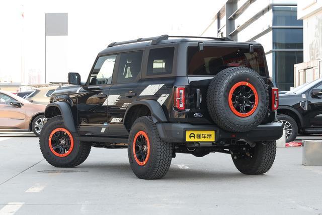 福特烈马60周年纪念版配备有固定式侧踏,前翼子板处提供专属纪念标识,车门底部则配有专属车身拉花,还采用了17英寸铝合金轮辋,搭配复古风格朱红色中心盖,印有“Bucking Bronco”以及“1966”字样 。车尾方面,该车继续提供侧开式尾门和外挂式备胎,备胎罩均为温布尔登白搭配红色“BRONCO”标识。
